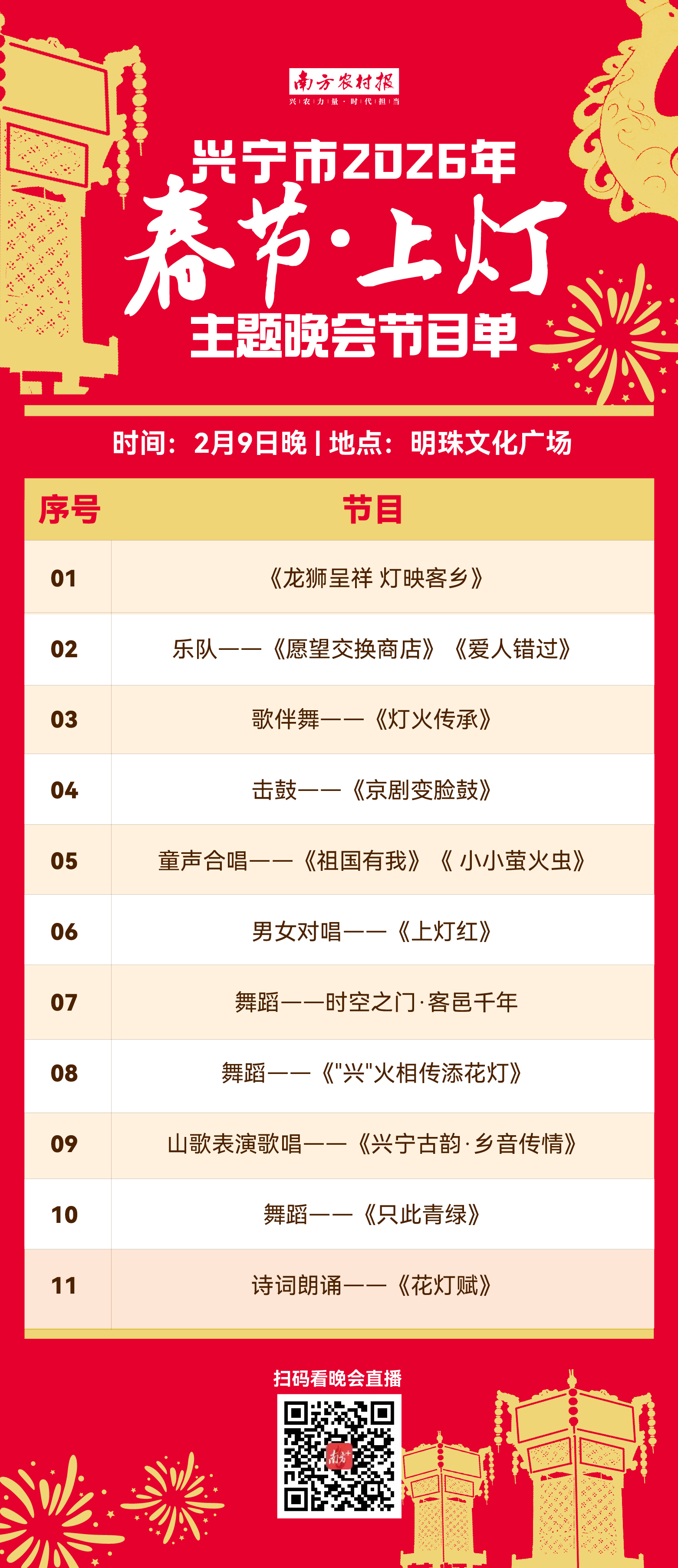 本场晚会不仅以艺术语言诠释客家文化、以灯火意象凝聚情感,更生动呈现了兴宁在“百千万工程”引领下推动非遗活化、促进文旅融合的实践图景。欢迎广大市民与游客查阅文末节目单了解详情,届时可亲临兴宁市明珠文化广场现场观赏,或通过扫描下方南方+直播平台二维码同步收看,共赴这场灯火相伴的新春文化之约。